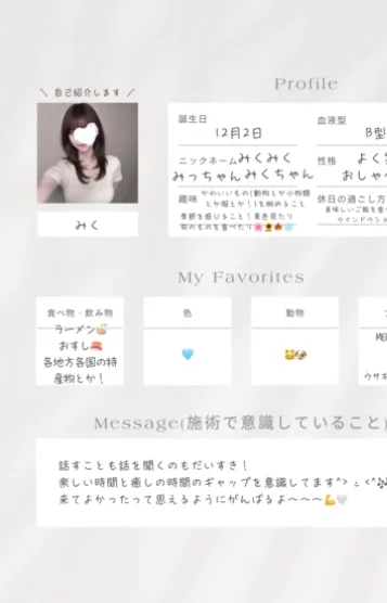 会った時からニコニコしてて、お話ししていると良い反応をしてくれるのでとても気持ちよくお話しできます。施術に自信がないと言っていましたが、そんなことはなくちゃんと満足させてくれる技量があります。
